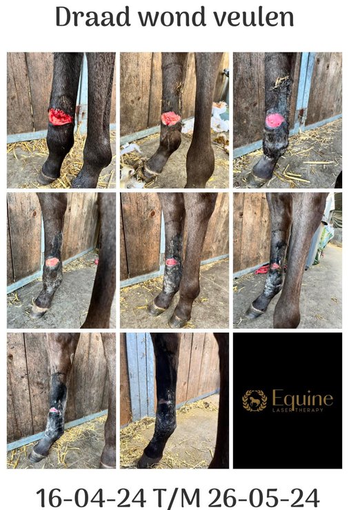Hier zie je een update van een draad wond bij een veulen die bijna dicht is. Door de laser therapie hebben we het herstel aanzienlijk versneld en heb je een mooiere genezing van de wond. Voordeel is dat de omliggende structuren gelijk mee behandeld worden, denk aan eventuele peesbeschadiging.